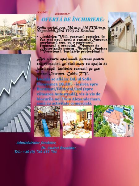 Închiriez Vilă de cca. 750 mp cu Demisol, complet renovată, în cea mai nouă zonă a orașului Suceava, amplasată sus, cu o panoramă frumoasă a orașului. Dispune de Autorizație de Incendii, Sanitar-Veterinară, bucătărie profesională. \r\nAre o curte spațioasă, parcare pentru cca 15 mașini, permite acces atât pentru autoturisme cât și pentru mașini mari (TIR), grădină mare cu spațiu de joacă copii, mese și băncuțe pentru recreere, încălzire centrală pe gaz metan, Internet, Cablu TV. \r\nPretabil pentru: Grădiniță, școală, Azil bătrâni, centru de cazare de orice tip, Clinica medicală etc. \r\nPrețul nu conține TVA si este negociabil.\r\nLocația se află în: Bd.-ul Sofia Vicoveanca 18, E85 - ieșirea spre București/Fălticeni/Iași (spre viitoarea Autostradă), vis-à-vis de blocurile noi Twin Alexanderman, zonă cu numeroase firme, și activitate comercială intensă.